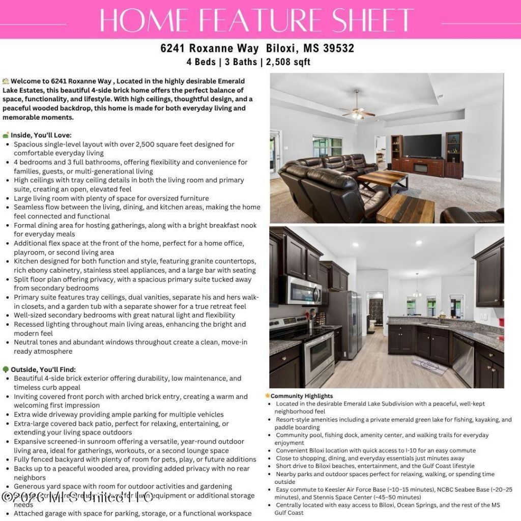 BACK ON THE MARKET AT NO FAULT OF THE SELLER!Even better, this home qualifies for a 2.5% assumable interest rate for eligible military buyers, making it a rare opportunity you don't want to miss.Welcome to 6241 Roxanne Way, where everyday living feels easy, spacious, and connected. Located in the highly desirable Emerald Lake Estates, this 4 bedroom, 3 full bathroom home offers over 2,500 square feet of single level living designed for both comfort and functionality.Inside, you will find an open layout with high ceilings, a bright living area, and a kitchen that flows naturally into both a formal dining space and a casual breakfast nook, making it ideal for both entertaining and daily life. The split floor plan provides privacy, with a spacious primary suite featuring dual vanities, separate his and hers closets, and a relaxing garden tub with a separate shower. A fourth bedroom with its own full bathroom offers the perfect setup for guests or extended family.Step outside and enjoy a fully fenced backyard that backs up to a peaceful wooded area, along with an extra large covered patio and a spacious screened-in sunroom that extends your living space year round.Living in Emerald Lake Estates means access to a true lifestyle community with a pool, lake, fishing dock, and amenities designed for enjoying the outdoors, whether it is kayaking, paddle boarding, or simply relaxing by the water.Conveniently located approximately 15 minutes from Keesler Air Force Base and about 25 minutes to Naval Construction Battalion Center Gulfport, with easy access to I-10, shopping, dining, and the Mississippi Gulf Coast beaches.This home offers the space you need, the layout that works, and a community that truly feels like home.
