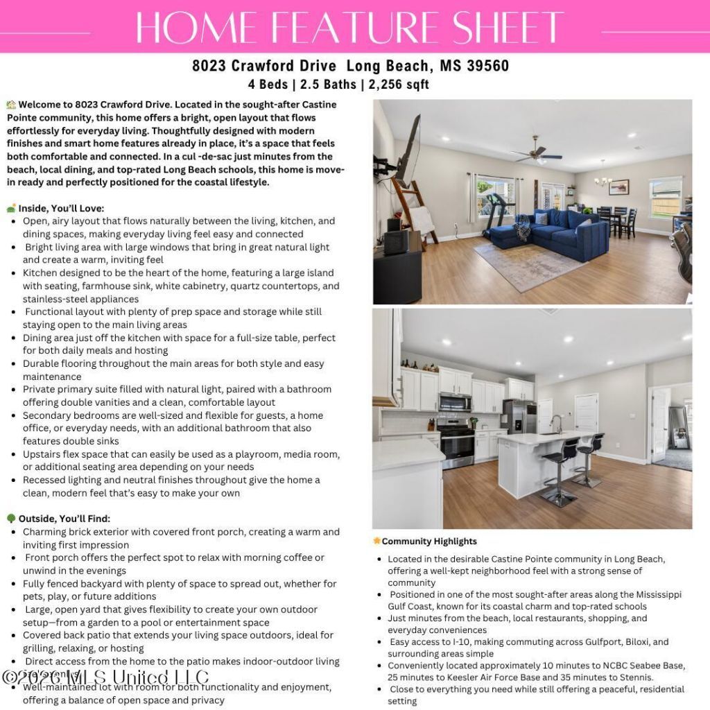 Welcome to 8023 Crawford Drive in Long Beach, MS, located in the sought-after Castine Pointe community and within the highly rated Long Beach School District. This 4-bedroom, 2.5-bath home offers a bright, open layout designed for comfortable, everyday living with a seamless flow between the kitchen, dining, and living spaces.The kitchen serves as the heart of the home, featuring quartz countertops, white cabinetry, stainless steel appliances, a farmhouse sink, and a large island with seating that keeps you connected while cooking or entertaining. Natural light fills the main living areas, creating a warm and inviting atmosphere throughout.The primary suite offers a private retreat with double vanities and a functional layout, while the additional bedrooms provide flexibility for guests, a home office, or growing needs. Upstairs, a versatile flex space adds even more value, perfect for a playroom, media room, or additional living area.Step outside to enjoy a fully fenced backyard with plenty of room to relax, play, or create your own outdoor setup, along with a covered back patio ideal for grilling or unwinding. The charming front porch adds even more space to enjoy the coastal lifestyle.Conveniently located in a cul-de- sac just minutes from the beach, shopping, dining, and entertainment, with easy access to I-10 for commuting. Approximately 10 minutes to NCBC Seabee Base, 25 minutes to Keesler Air Force Base and 35 minutes to Stennis making this an excellent option for military relocation or anyone looking to enjoy the Mississippi Gulf Coast lifestyle.